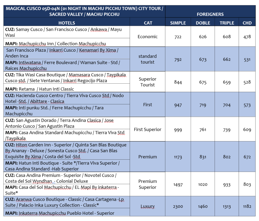 - Return train tickets (EXPEDITION PeruRail or VOYAGER Inca Rail, subject to availability)