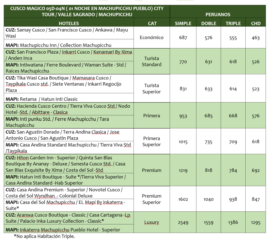 - El hotel en Machupicchu pueblo es más básico a pesar de la misma categoría que los Hoteles en Cusco.
