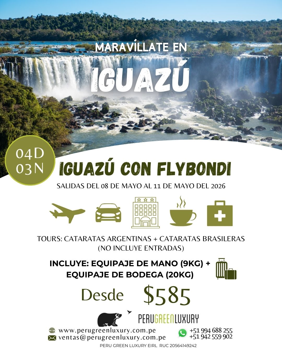 - Opciones de excursiones a las cataratas: elija una opción (SIN ENTRADAS)